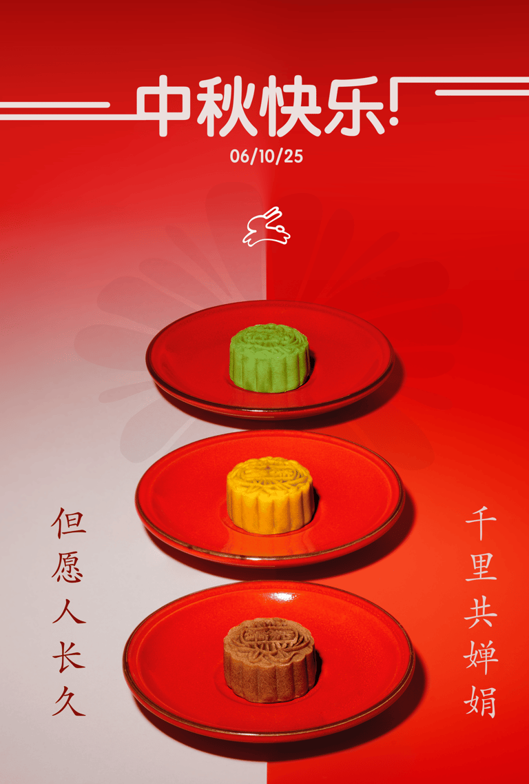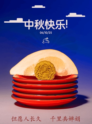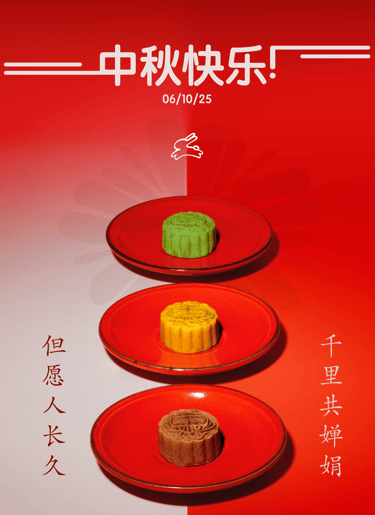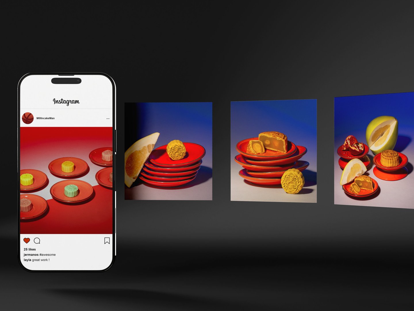 The concept reduces the festival to its most iconic symbols such as mooncakes and circular moon motifs. They are expressed through strong geometry and pure primary colors. By stripping each image down to essential shapes and shadows, the series transforms cultural rituals into striking, contemporary visual icons.