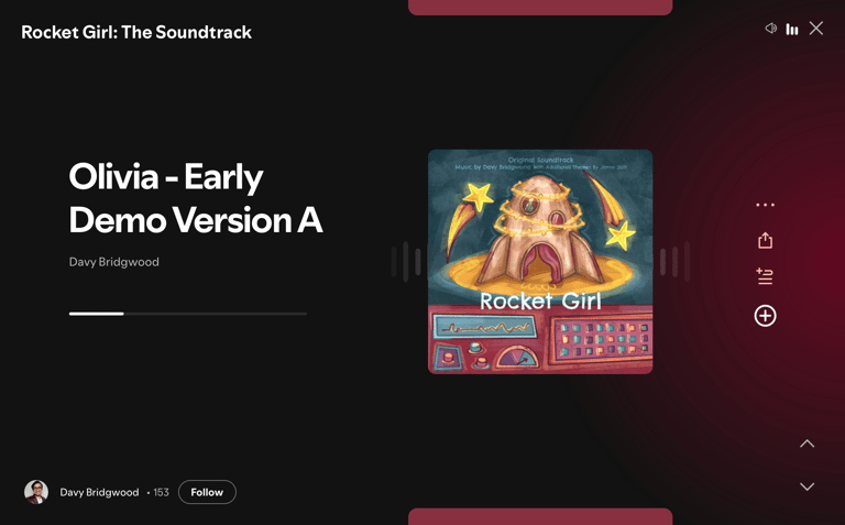 Design a Spotify artwork cover for composer Davy Bridgwood’s original score for the short film Rocket Girl. The visual needed to reflect the emotional tone and narrative arc of the film, while also capturing the unique qualities of Bridgwood’s musical style. The final artwork had to work effectively within Spotify’s format and resolution specifications.